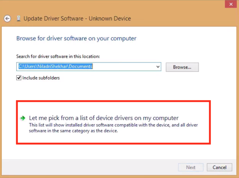 - From the location box, select **Let me pick from a list of device drivers from my computer**.