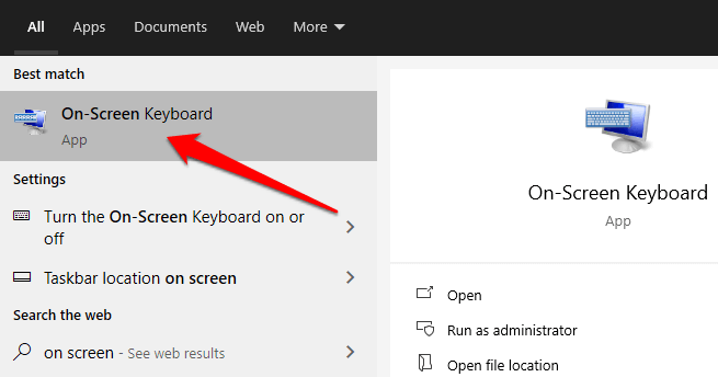 - Select the **On-screen Keyboard** option in the search results to open the keyboard.