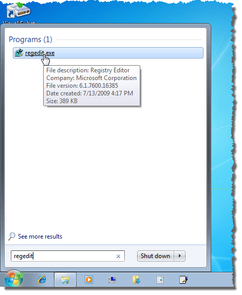 There is a key in the registry that stores data about the Taskbar that you should also backup. To do this, open the Start menu and enter “regedit” (without the quotes) in the Search programs and files box. When regedit.exe displays in the list of results, click the link.
