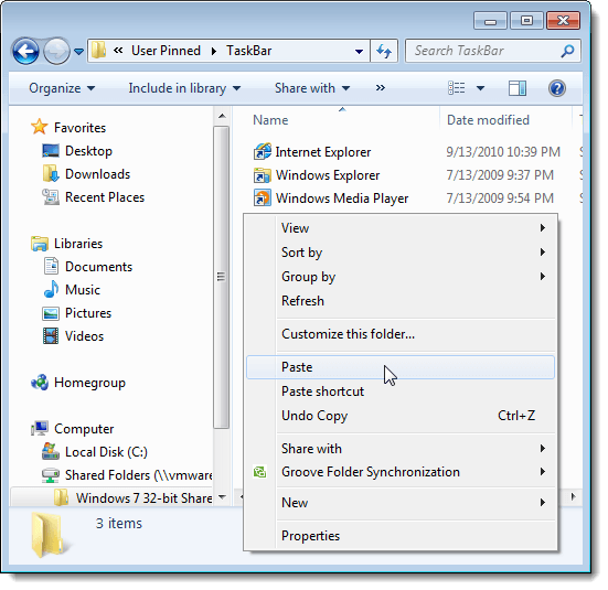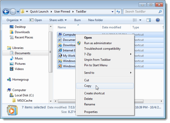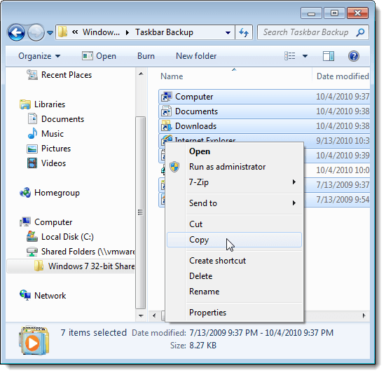 To restore your pinned Taskbar items, open Windows Explorer and navigate to the directory where you stored the Taskbar shortcut files and the .reg file. Select the shortcut files (not the .reg file, yet), right-click on the files, and select Copy from the popup menu.