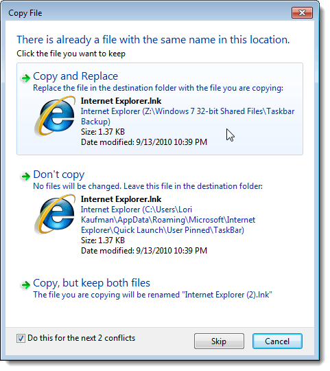 When the Copy File dialog box displays, select the Do this for the next X conflicts check box (X may vary, depending on how many shortcuts will be replaced). Then, click the Copy and Replace button.