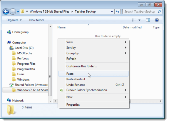 Navigate to the folder you are using to store the Taskbar backup files. Right-click in the folder and select Paste from the popup menu.