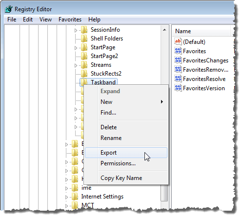 Right-click on the Taskband key and select Export from the popup menu.