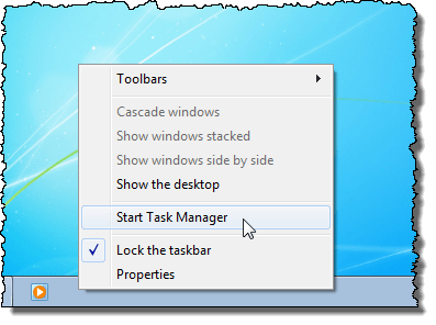 Notice that your pinned items do not immediately display on the Taskbar. You need to end the Explorer process and restart it for the items to show up. To do this, right-click on the Taskbar and select Start Task Manager from the popup menu.