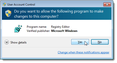 Double-click the .reg file on the Desktop and click Yes on the User Account Control dialog box that displays.