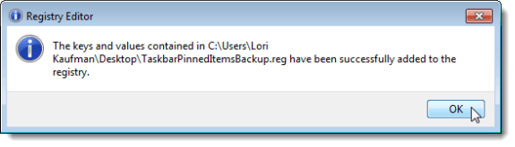 NOTE: We found that .reg files do not always run from external drives or network drives, so we copied the TaskbarPinnedItemsBackup.reg file to our desktop before adding the key back into the registry.