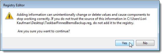 A confirmation dialog box displays to make sure you really want to add the information in the .reg file to the registry. Click Yes.