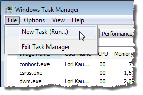To restart the Explorer process, select New Task (Run…) from the File menu.