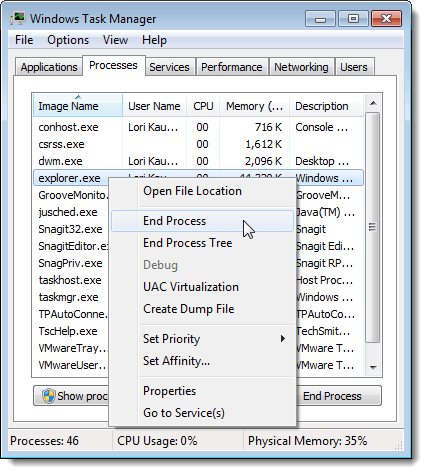 On the Windows Task Manager dialog box, click the Processes tab. Right-click on the explorer.exe task in the list and select End Process from the popup menu.