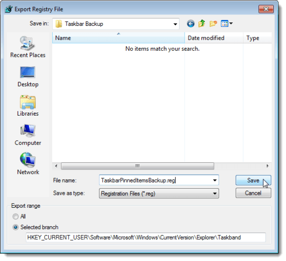At the bottom of the Export Registry File dialog box, notice Selected branch is selected and the value matches the registry key you selected. Navigate to the folder where you are storing your Taskbar backup files. Enter a name for your registry key backup file, putting a .reg extension on the filename. Click Save.