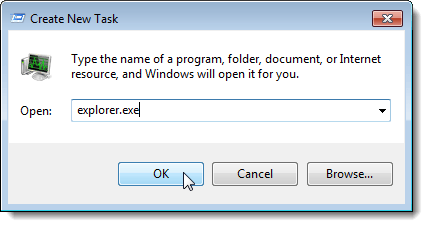 On the Create New Task dialog box, enter “explorer.exe” (without the quotes) in the Open edit box and click OK.