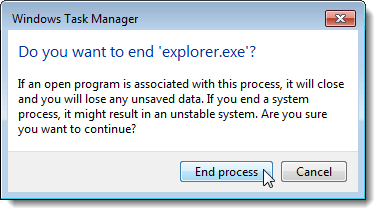 A dialog box displays to make sure you really want to end the Explorer process. Click End process.
