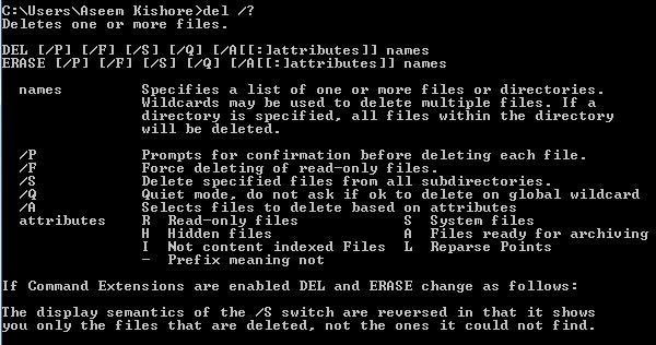 So now that we have a list of files and folders, let’s continue with our deleting a virus example. If you want to delete a file, you would use the DEL command. Again typing in DEL /? will give you some useful info on the command.