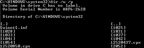 As you can see, you could type in DIR /P to give the list in a paginated format that you can browse through slowly. Or you could type in DIR /W to get the list in a wide format rather than one single column. The cool thing about DOS is that you can include several parameters for each command, so you could type in DIR /P /W and get a page-by-page view along with wide format: