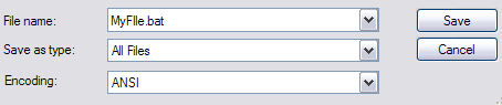 So if you want to be able to routinely perform some simple actions on your computer, like copying files from one folder to another, just type the commands into Notepad and save the file with a .BAT extension instead of as a text file. Basically, you have to choose All Files for the File Type option and then type in the name like “MyFile.bat” with the quotes included.