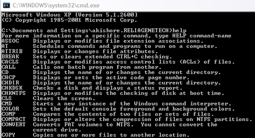 You’ll now see a large black window with the cursor at the end of the path to your user profile in** C:\Documents and Settings\Username** or C:\Users\Username. So what to do now!? Well, since I can’t explain everything, you’ll probably want to end up using some of the help guides that are provided in MS DOS itself by typing in HELP and pressing Enter.
