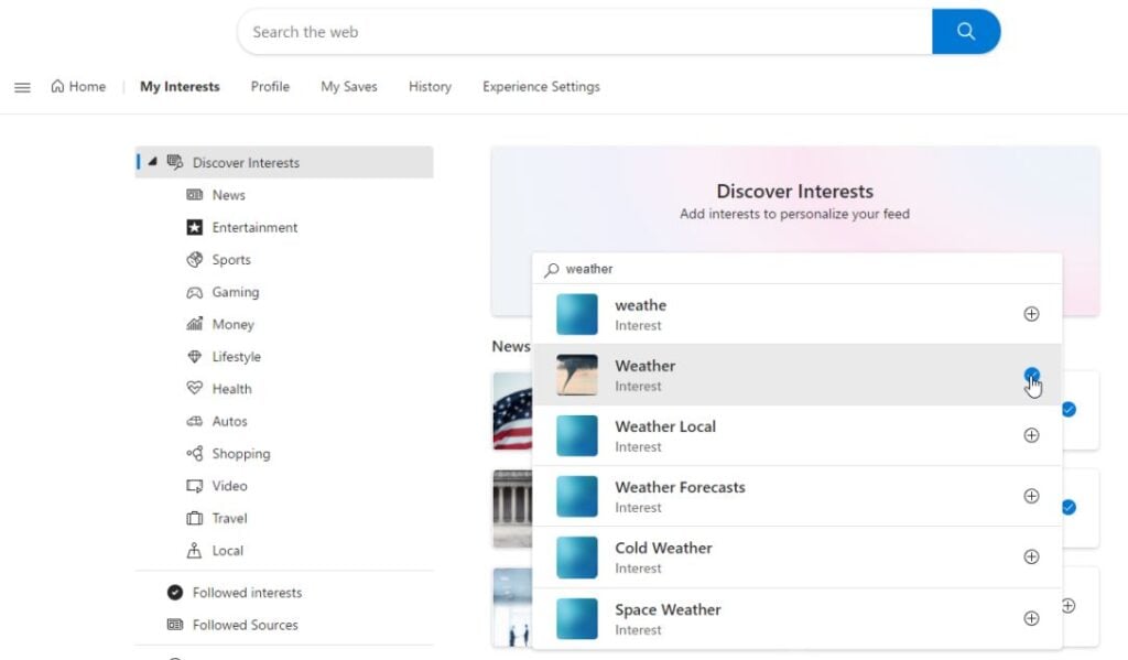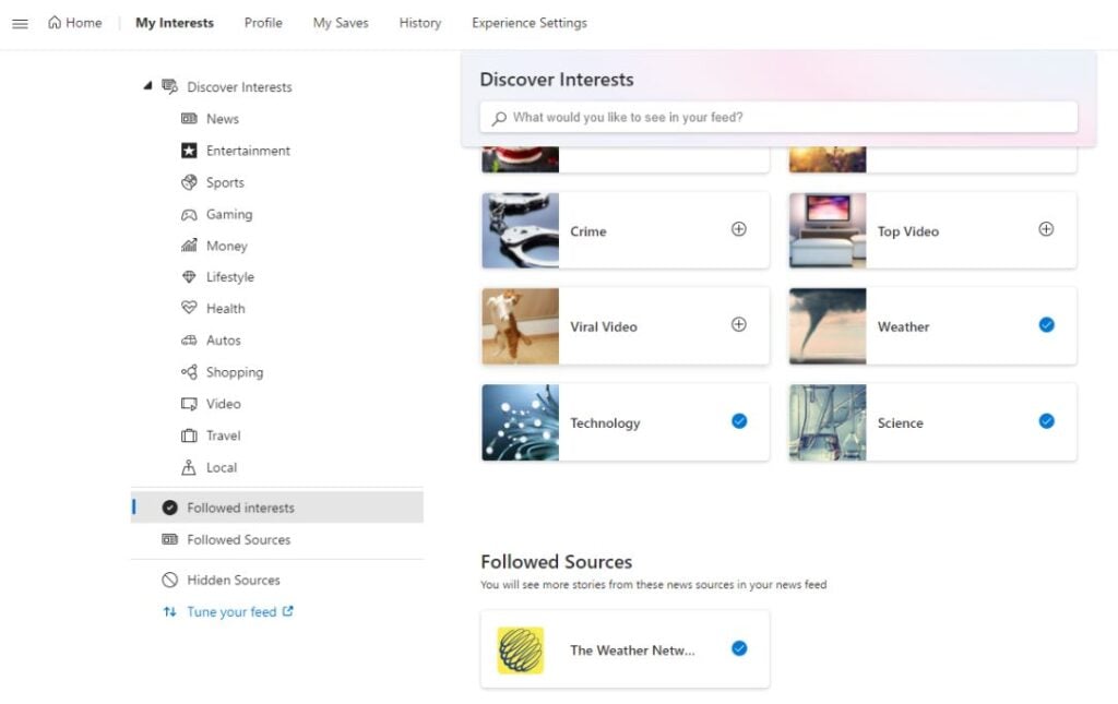 - If you scroll down the Microsoft Interests search page, you’ll see all of the Interests you selected in the Followed Sources section with a blue checkmark on the right.