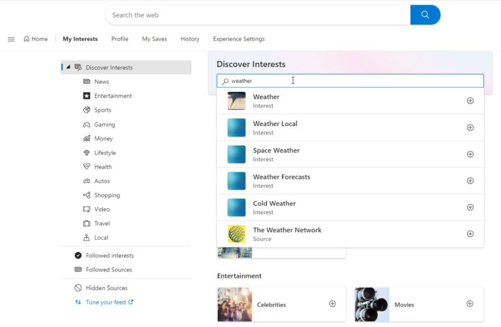 - This will open the Microsoft Interests search page. In the search field, type Weather. This will display all of the available weather interests. You can also search for RSS feeds, news and interests of any type if you prefer. News widgets are very popular as well.
