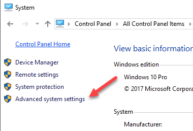 From the System window, select the option Advanced system settings, located along the left side of the window.