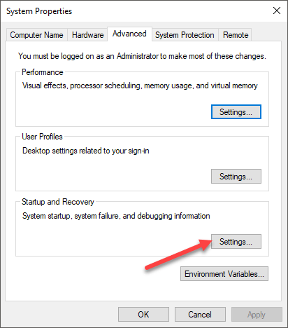 Finally, select the Settings button listed under the Startup and Recovery, Advanced tab of System Properties.