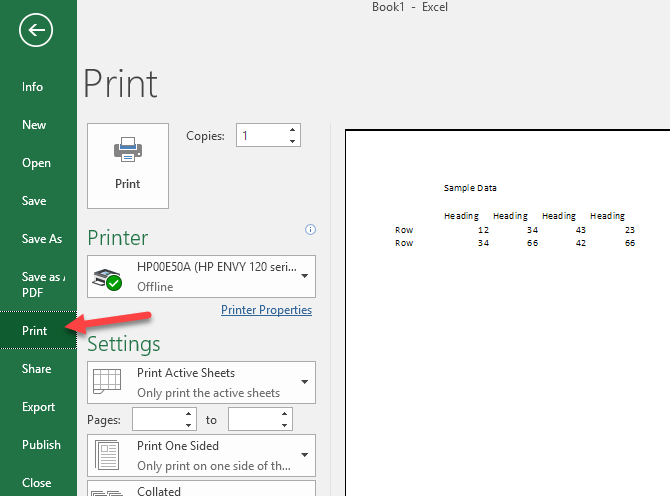To see how your worksheet will display when printed, click on File and then Print. You’ll get a preview of the document at the far right.