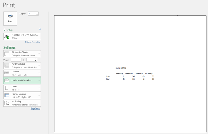 Click the Preview Preview button and now you will see the data centered on the page. You can also change the page orientation and it will remain centered.