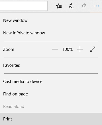 If you are using Microsoft Edge, you can turn off headers and footers, but it’s a slightly different process. First, click on the settings icons at the far right and then click on Print.