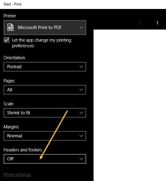 On the following print dialog, you should see an option all the way at the bottom called** Headers and Footers**. Choose Off from the drop-down list.