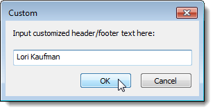 The Custom dialog box displays. Enter the text you want to display on the header or footer in the edit box and click OK.