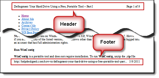 By default, when you print a web page in Internet Explorer or Microsoft Edge, a header containing the page title and the page number and total number of pages and a footer containing the URL of the page and the date is added to the printed web page.