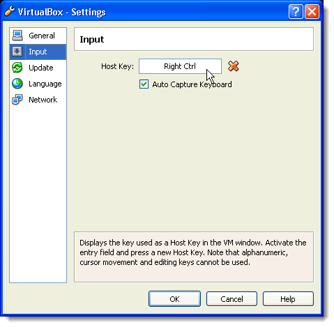 On the Input screen you can also choose to automatically capture the keyboard when you open a virtual machine. To do this, select the Auto Capture Keyboard check box. This means all keystrokes are directed to the virtual machine until you press the Host key to return control of the mouse and keyboard to the host machine.