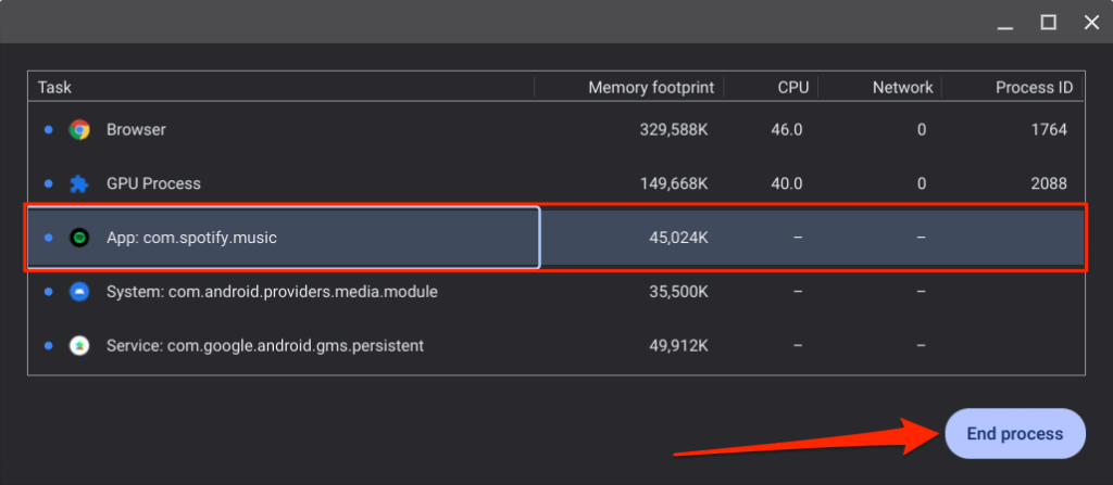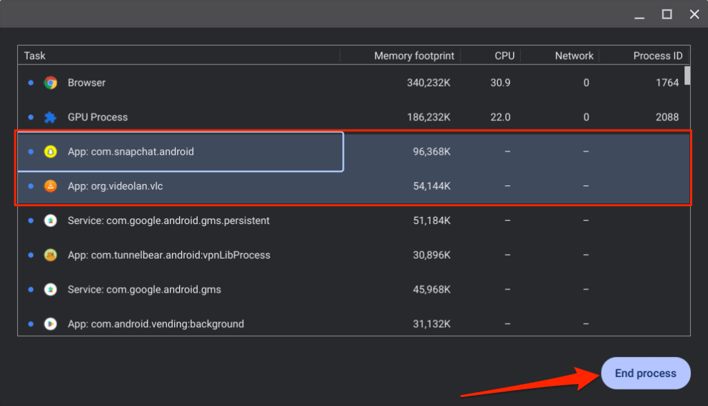 Follow the steps below to close applications using the ChromeOS Task Manager.