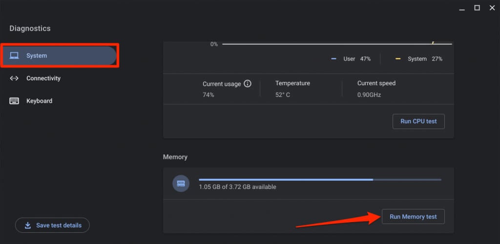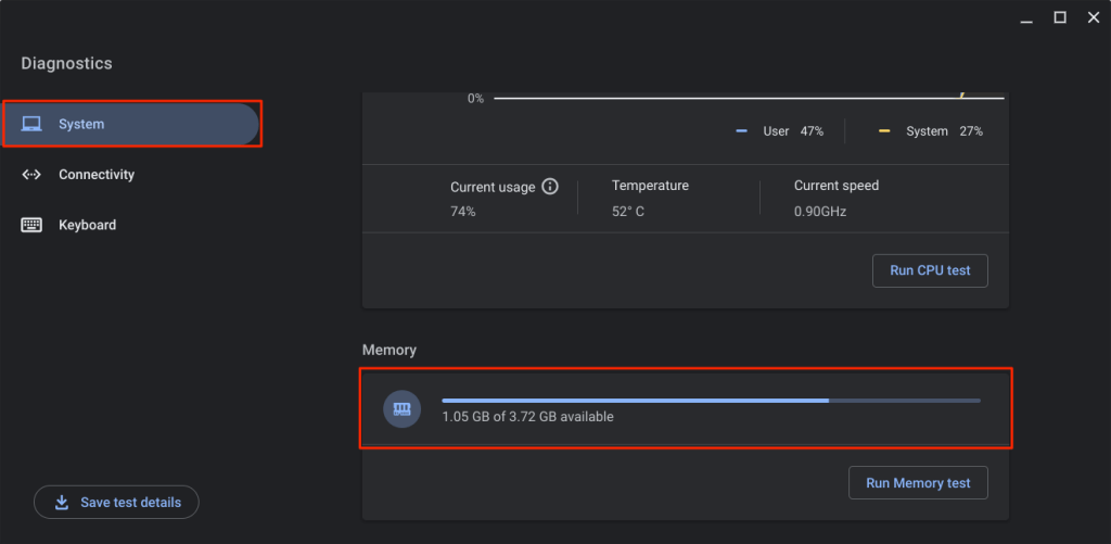 The Chromebook Diagnostics app has a memory test tool that diagnoses hardware-related issues or damages to your device’s memory. Run a memory test if your Chromebook continues running slowly after a reboot or closing all apps.