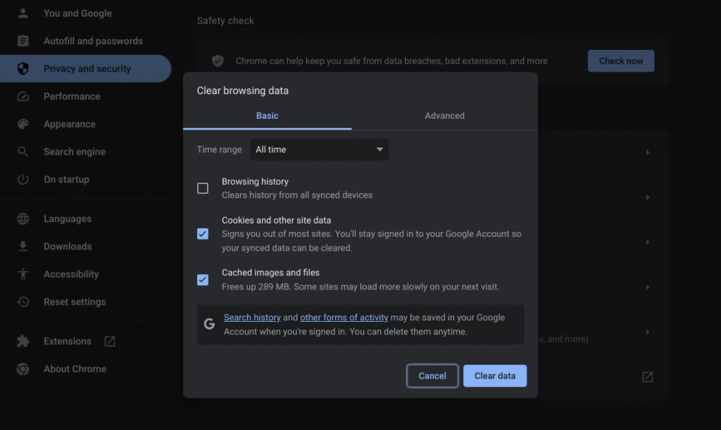 Select Browsing data to review and clear Chrome’s browsing history, cached images, cookies, and other site data.