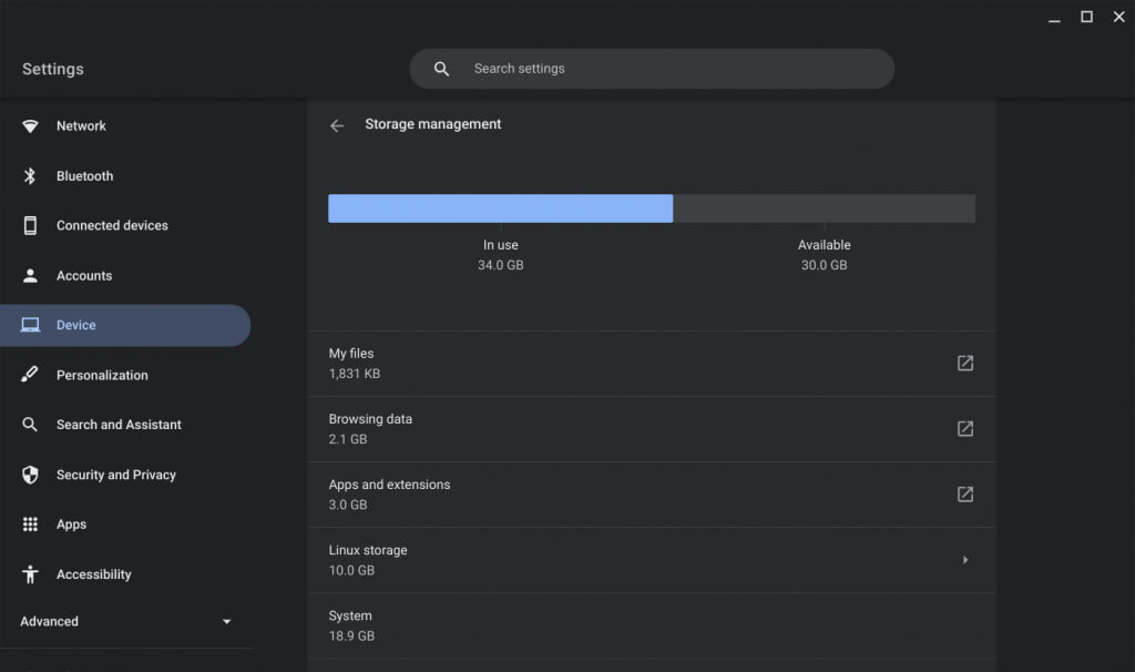 Go to Settings > Device > Storage management to check your Chromebook’s storage status.