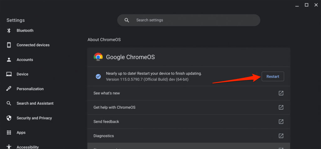 Go to Settings > About ChromeOS and select Check for updates or Restart to install a pending update.