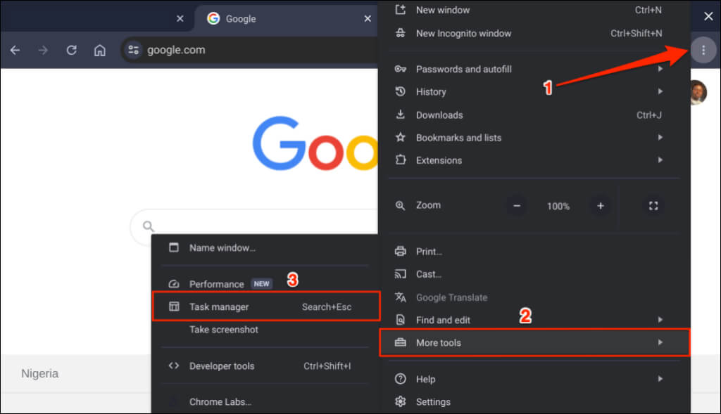 Alternatively, open Chrome, tap the three-dot menu icon in the top-right corner, and select More Tool > Task Manager.