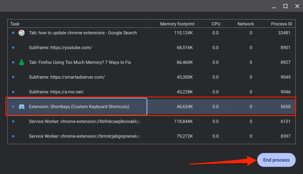 - Check the memory footprints of tasks with an “Extension:” suffix. Terminate extensions using an unreasonably high amount of memory and update all Chrome extensions. * Select the extension and select the End process button.