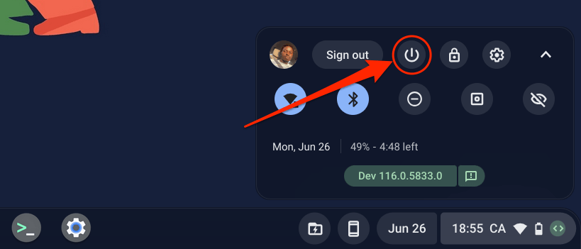Alternatively, press and hold your Chromebook’s Power button for 3-5 seconds and select Shut Down on the power menu.