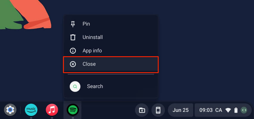 Right-click the app icon on your Chromebook’s shelf and select Close.