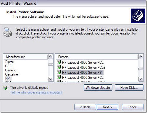 Now you will have to choose the driver for the printer you want to install. If it is not in the default list provided by Windows XP, you will have to download it, click Have Disk and point to the location of the printer driver. Click Next when you are done.