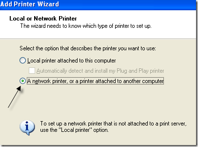 On the Welcome screen click Next. Choose A network printer, or printer attached to another computer and click** Next.**