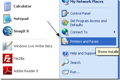 Whichever method you are using, you will always have to click on Printers and Faxes from the Start Menu or from the Control Panel.