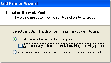 For connecting this way, instead of selecting** A network printer**, you will choose Local printer attached to this computer and make sure to uncheck the Automatically detect and install my Plug and Play printer.