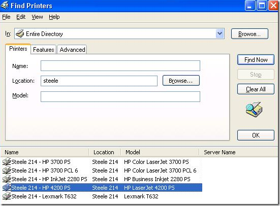 Click the Find button and you should get a list of all the networked printers available in Active Directory.