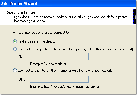 Now if you are on a domain, you want to choose Find a printer in the directory and click Next. This will search for all printers in Active Directory.