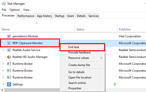 - Launch the Windows Task Manager and locate RDP Clipboard (or rdpclip.exe) in the Processes tab. Right-click on the process and select End Task.