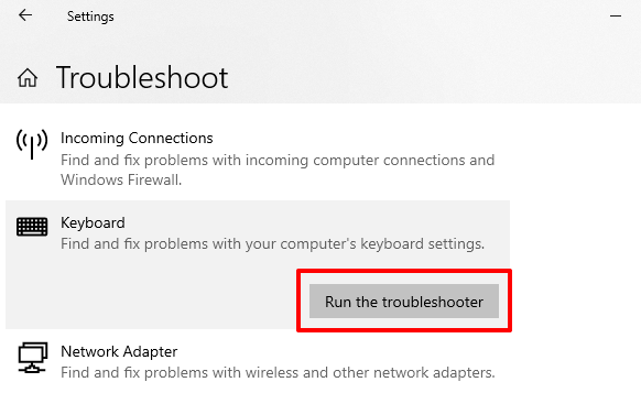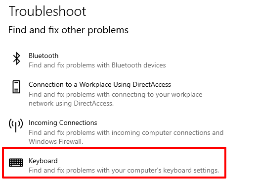 - Go to Settings > Update & Security > Troubleshoot and click Keyboard in the “Find and fix other problems” section.