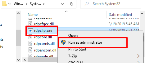 Right-click on the Remote Desktop Clipboard’s executable file (rdpclip.exe) and select Run as administrator.