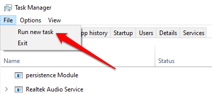 - To restart the process, click File on the Task Manager’s menu bar and select Create new task.